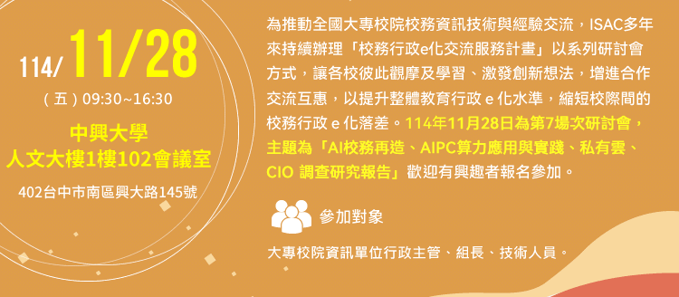 114/11/28(五)研討會:AI校務再造、AIPC算力應用與實踐、私有雲、OPENDATA宣導、CIO 調查研究報告